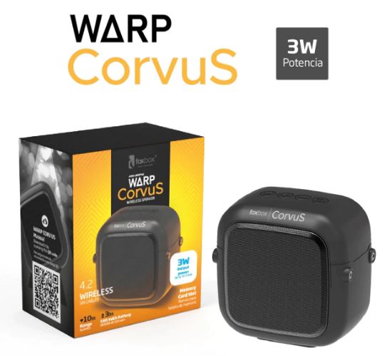 El Parlante Foxbox Warp Corvus cuenta con una duración de 3hs de reproducción gracias a su batería de 500mAh y tiene una ranura para que puedas insertar una tarjeta de memoria. Dentro de la caja encontrarás un cable USB que te permitirá cargarlo y un cable auxiliar para conectar el parlante a cualquier dispositivo y llevar tu música a todos lados.